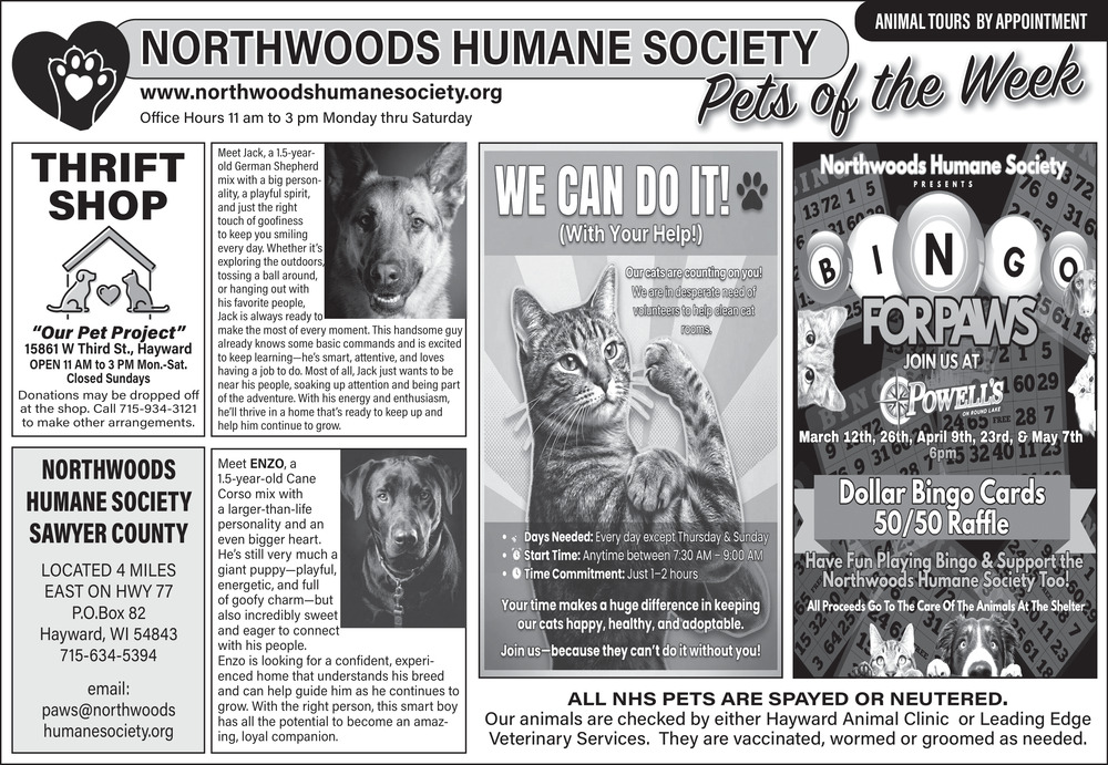 Apr 15, 2026. Northwoods Humane Society Organization Ads from Sawyer County Record