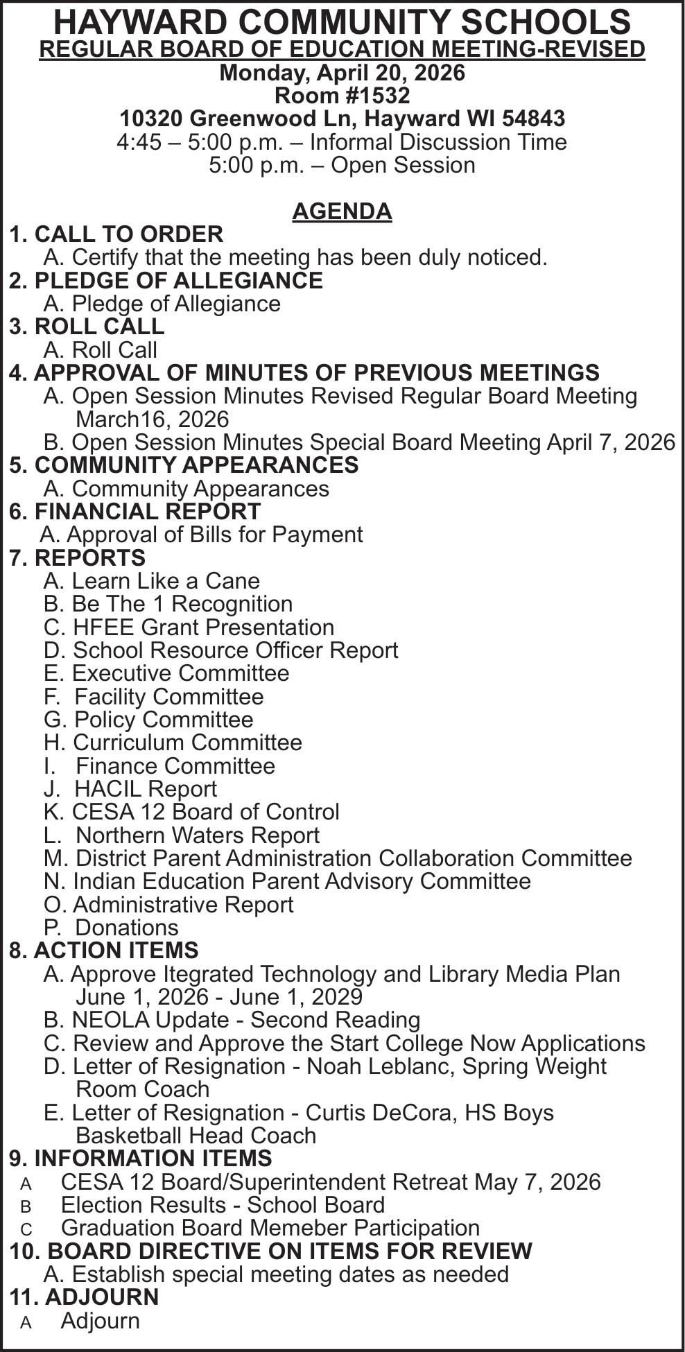 Apr 15, 2026. Hayward Community School District Public Notice Ads from Sawyer County Record