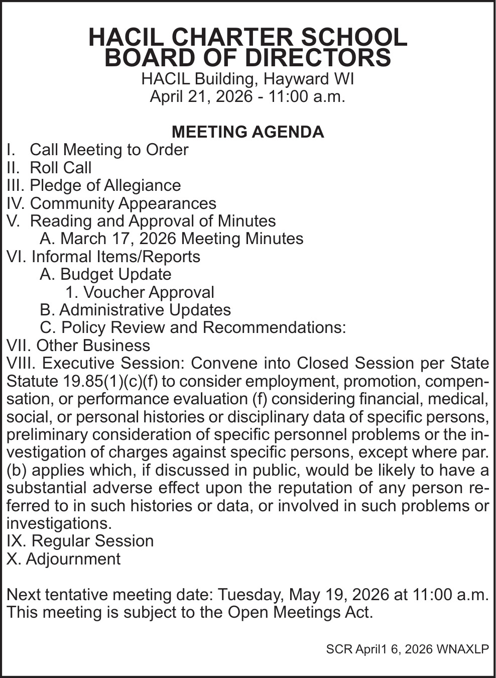 Apr 15, 2026. HACIL Charter School Public Notice Ads from Sawyer County Record