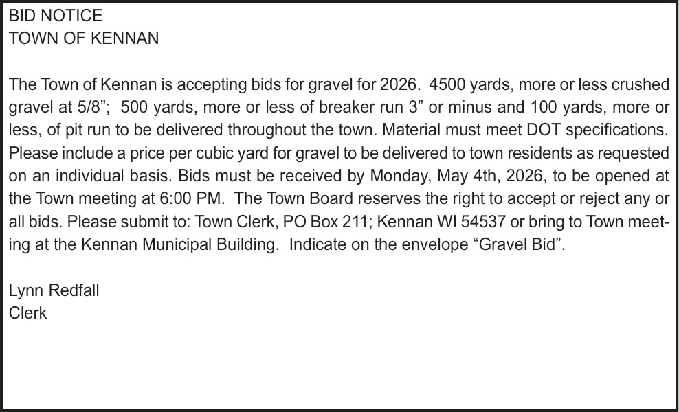 Apr 16, 2026. Town of Kennan Public Notice Ads from Price County Review