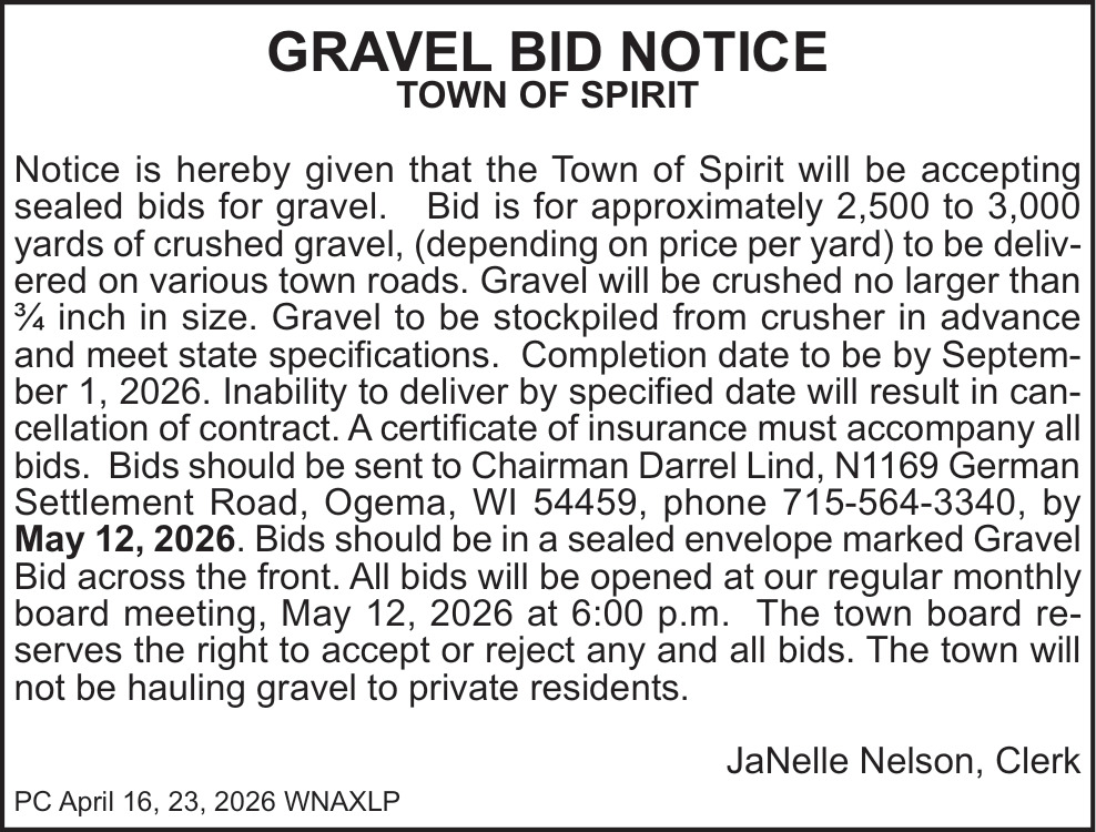 Apr 16, 2026. Town of Spirit Public Notice Ads from Price County Review