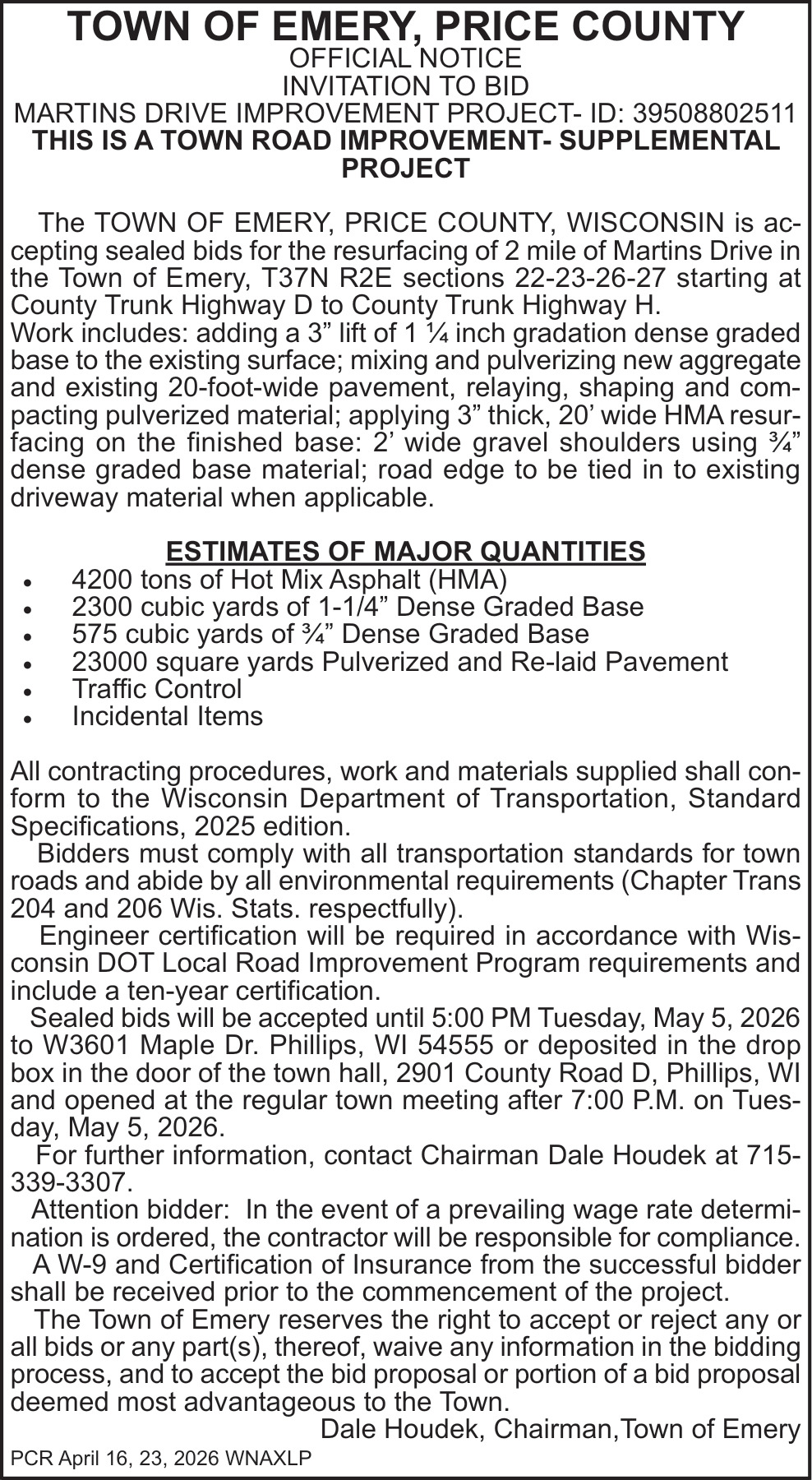 Apr 16, 2026. Town of Emery Public Notice Ads from Price County Review