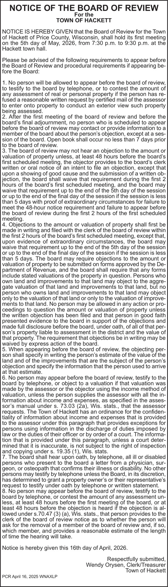Apr 16, 2026. Town of Hackett Public Notice Ads from Price County Review