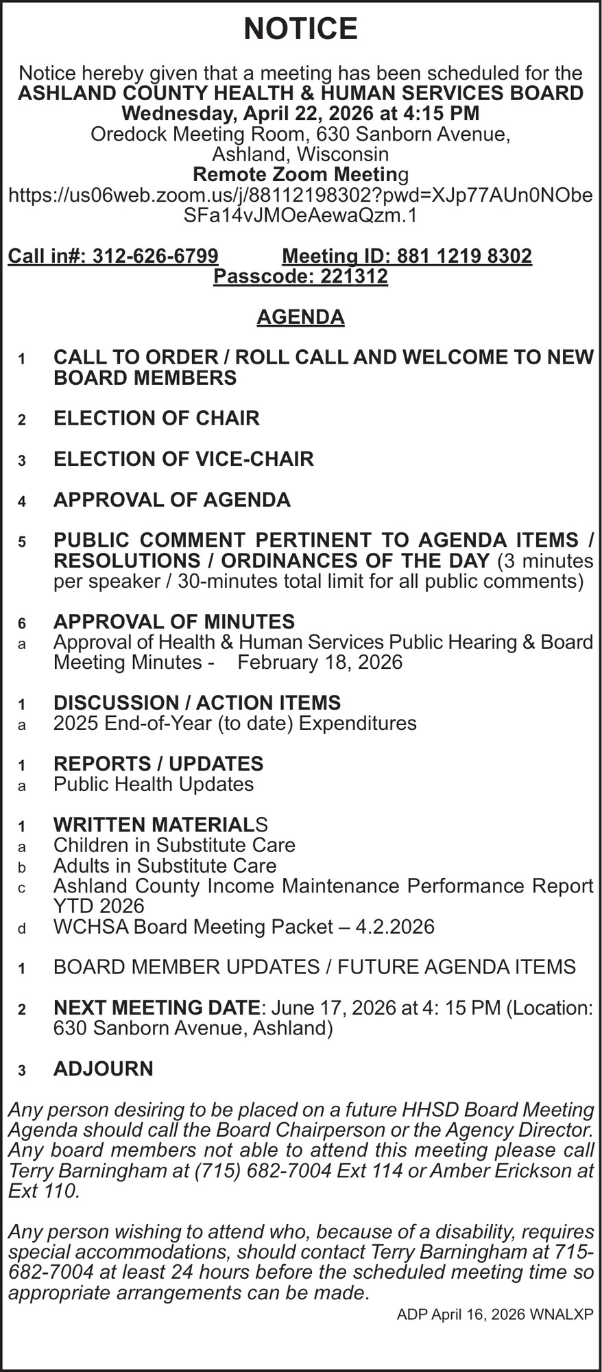 Apr 16, 2026. Ashland County Health & Human Services Government Ads from Ashland Daily Press