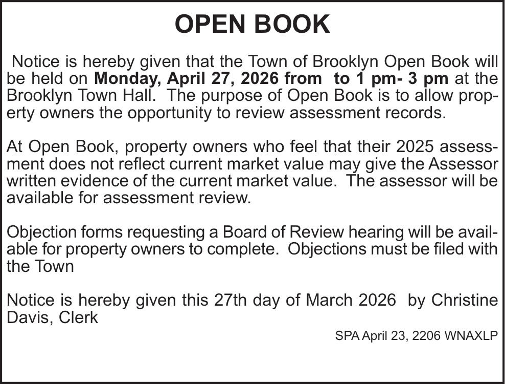 Apr 23, 2026. Town of Brooklyn Public Notice Ads from Spooner Advocate