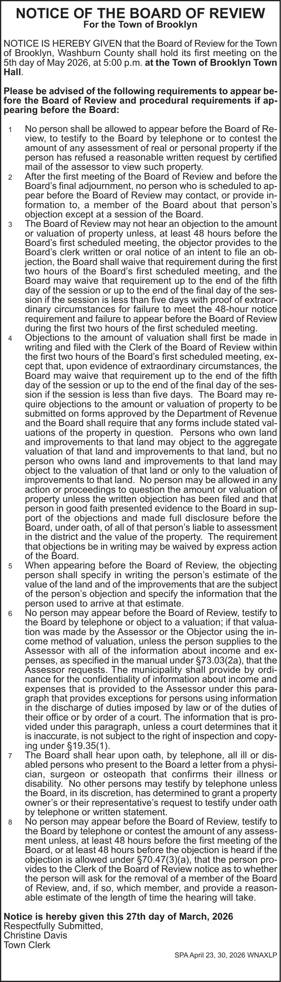 Apr 23, 2026. Town of Brooklyn Public Notice Ads from Spooner Advocate