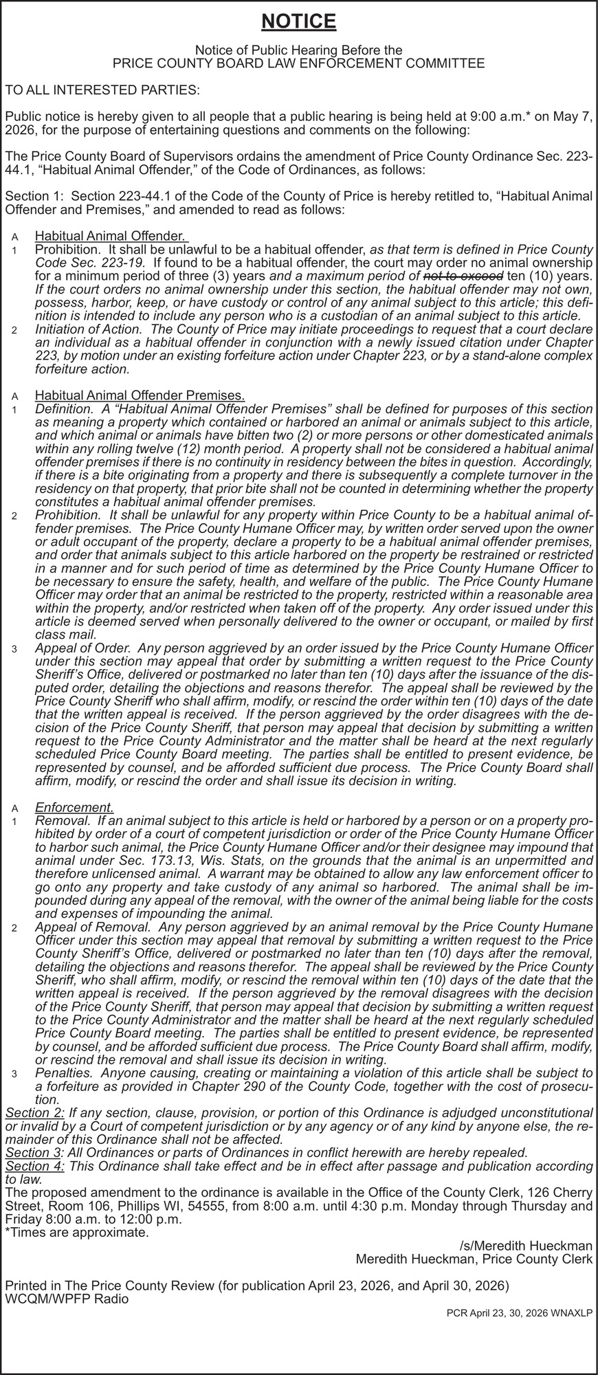Apr 23, 2026. Price County Public Notice Ads from Price County Review