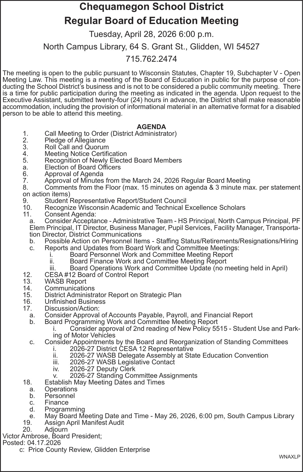 Apr 23, 2026. Chequamegon School District Public Notice Ads from Price County Review