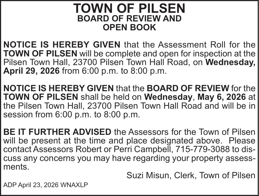 Apr 23, 2026. Town Of Pilsen Public Notice Ads from Ashland Daily Press