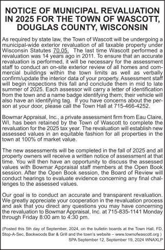 Sep 12, 2024. Town of Wascott Public Notice Ads from Spooner Advocate