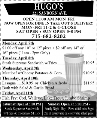 Apr 02, 2025. Hugo's Pizza Restaurants Ads from Ashland Daily Press