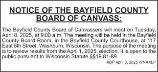 Apr 03, 2025. Bayfield County Board of Canvass Public Notice Ads from Ashland Daily Press