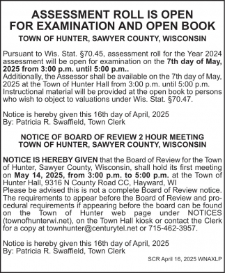 Apr 16, 2025. Town Of Hunter Public Notice Ads from Sawyer County Record