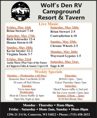 May 13, 2025. Wolf's Den RV Campground Campground Ads from Rice Lake Chronotype