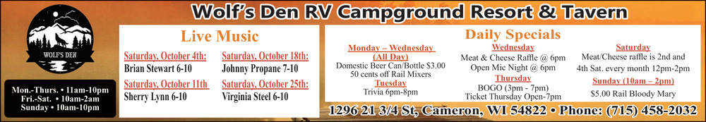 Oct 01, 2025. Wolf's Den RV Campground Campground Ads from Rice Lake Chronotype