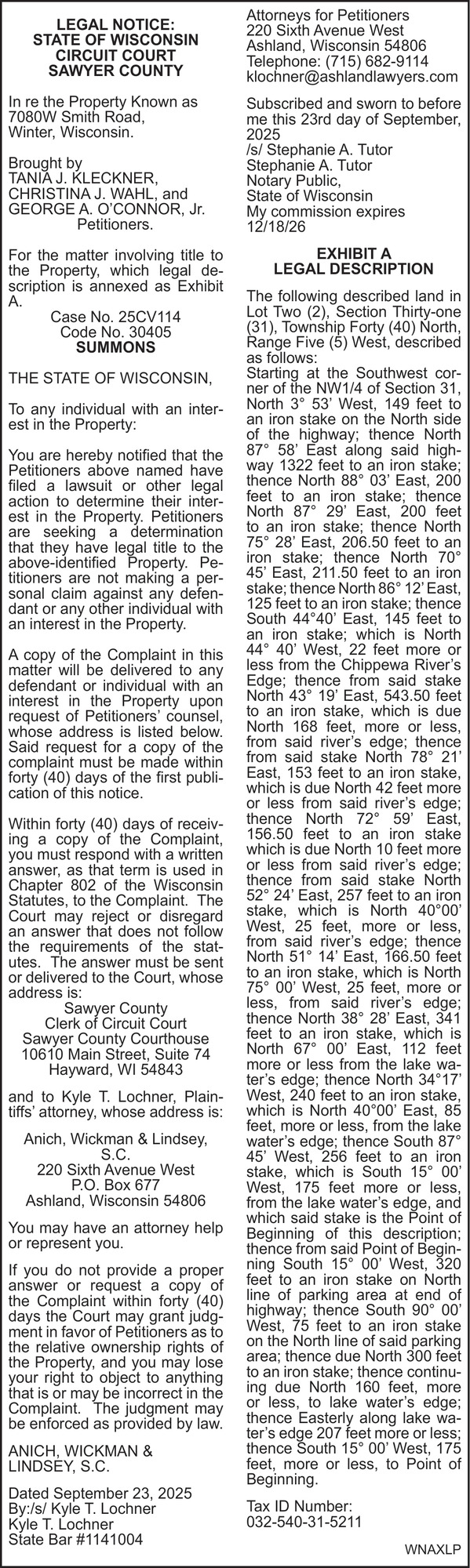 Oct 01, 2025. Anich, Wickman & Lindsey S.C. Attorneys Ads from Sawyer County Record