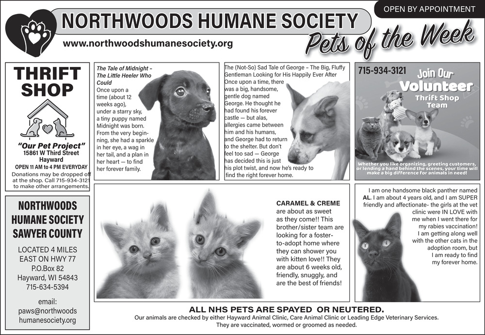 Oct 01, 2025. Northwoods Humane Society Organization Ads from Sawyer County Record