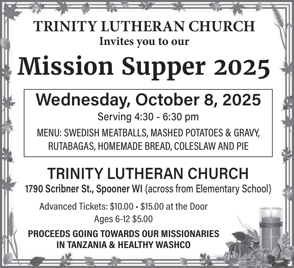Oct 02, 2025. Trinity Lutheran Church - Spooner Church Ads from Spooner Advocate