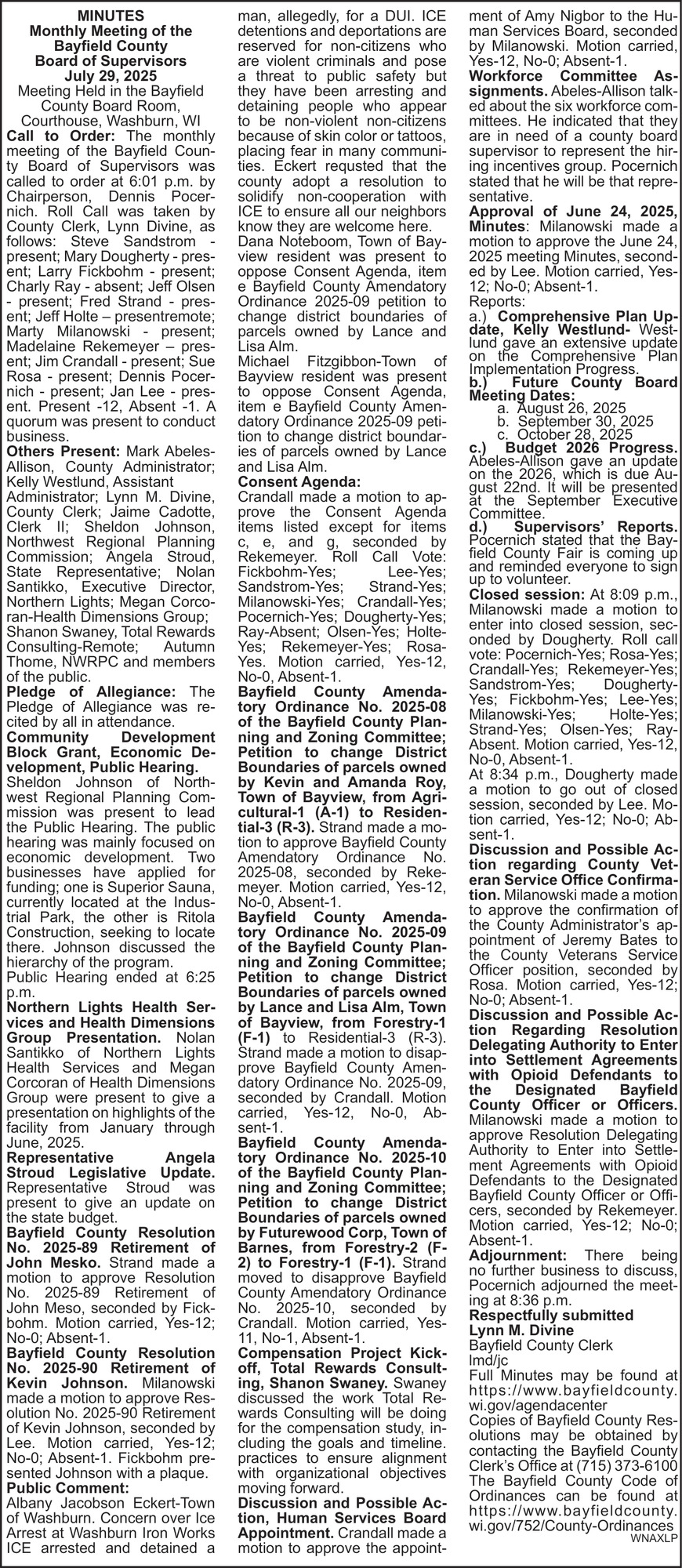 Oct 02, 2025. Bayfield County Clerk Public Notice Ads from Ashland Daily Press