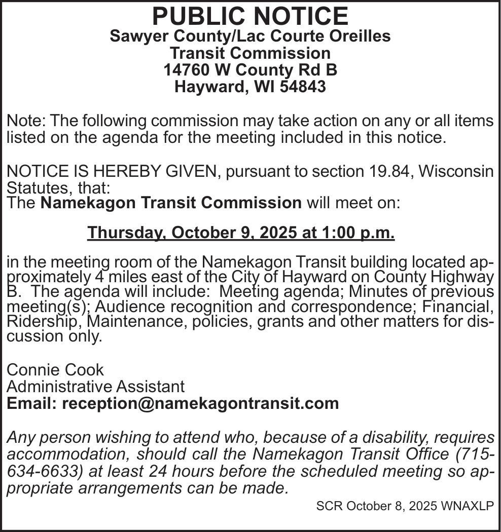 Oct 08, 2025. Namekagon Transit Public Notice Ads from Sawyer County Record