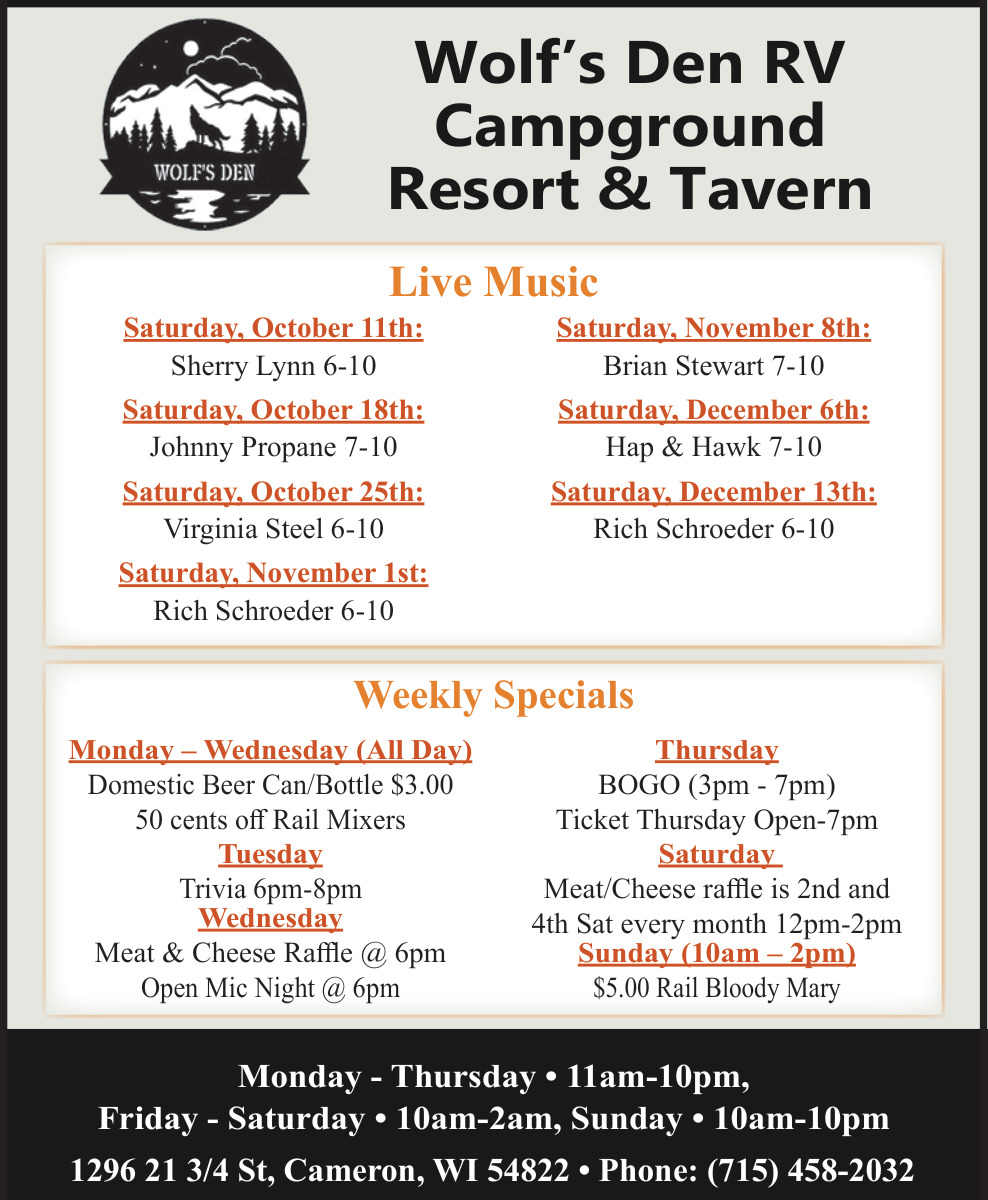 Oct 08, 2025. Wolf's Den RV Campground Campground Ads from Rice Lake Chronotype