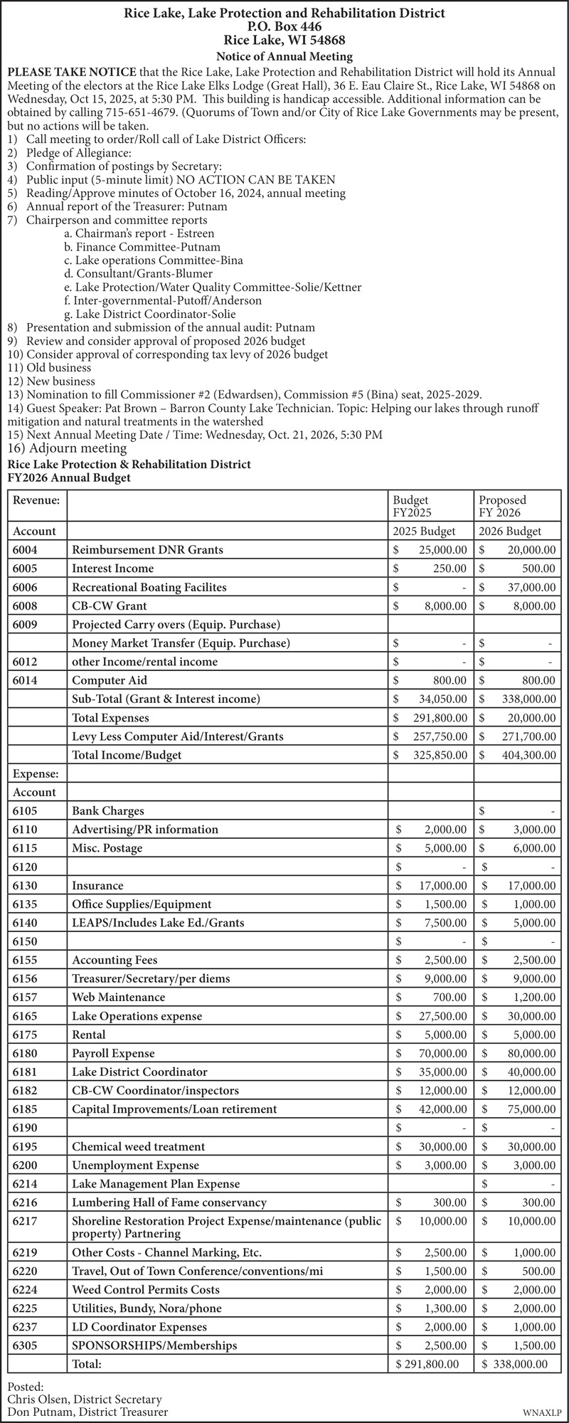 Oct 08, 2025. The Rice Lake Protection and Rehabilitation District Public Notice Ads from Rice Lake Chronotype