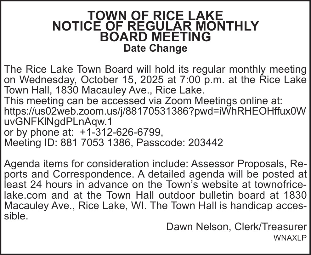 Oct 08, 2025. Town Of Rice Lake Public Notice Ads from Rice Lake Chronotype