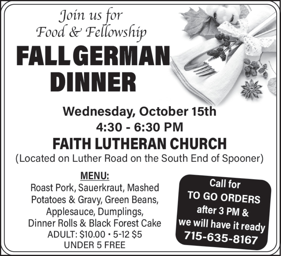 Oct 09, 2025. Faith Lutheran Church - Spooner Church Ads from Spooner Advocate
