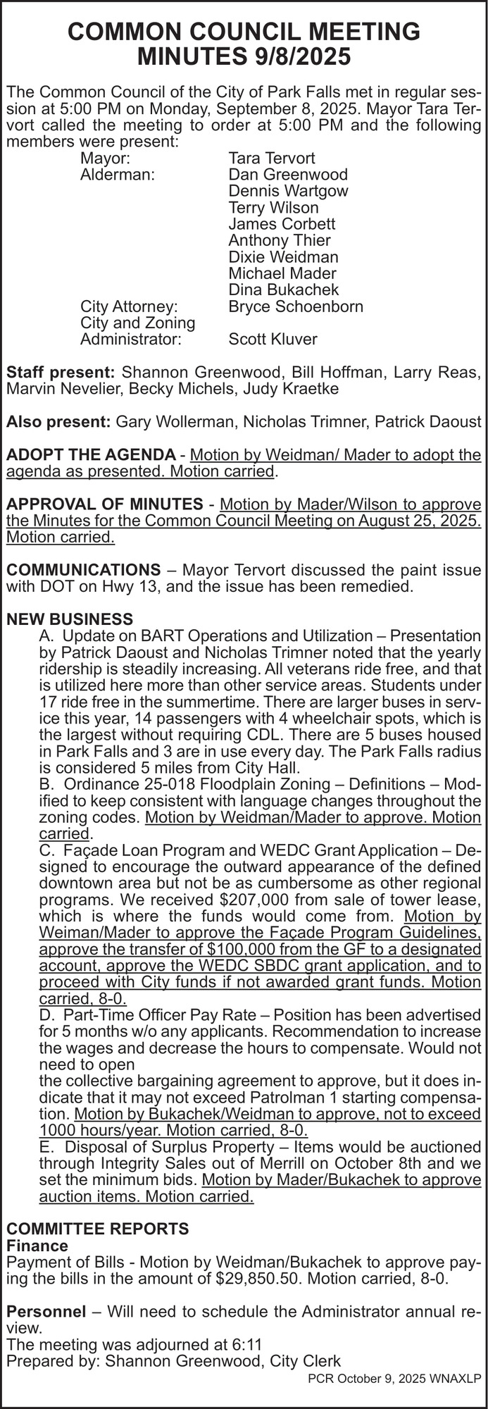 Oct 09, 2025. City of Park Falls Public Notice Ads from Price County Review