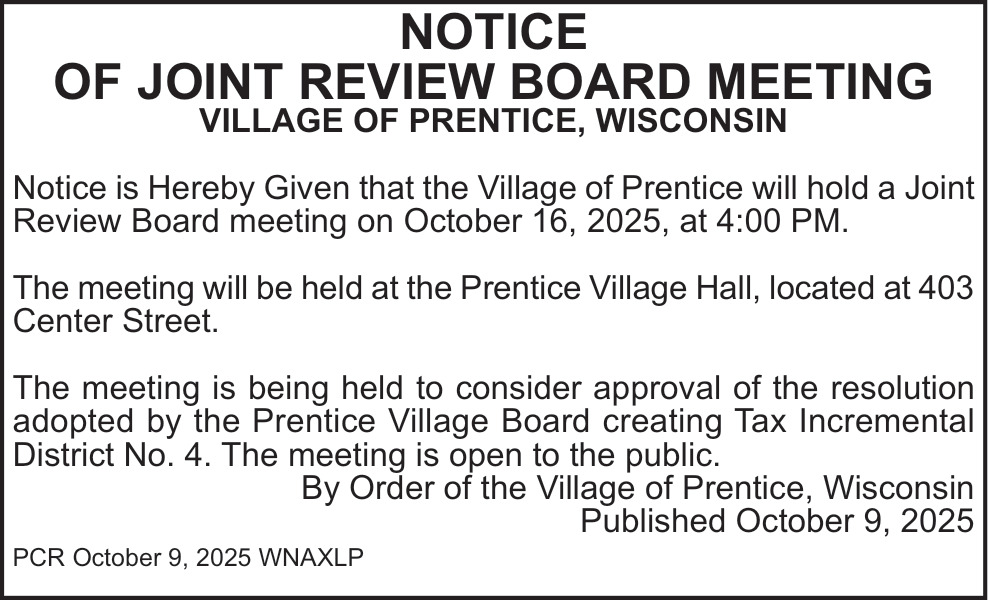 Oct 09, 2025. Village Of Prentice Public Notice Ads from Price County Review