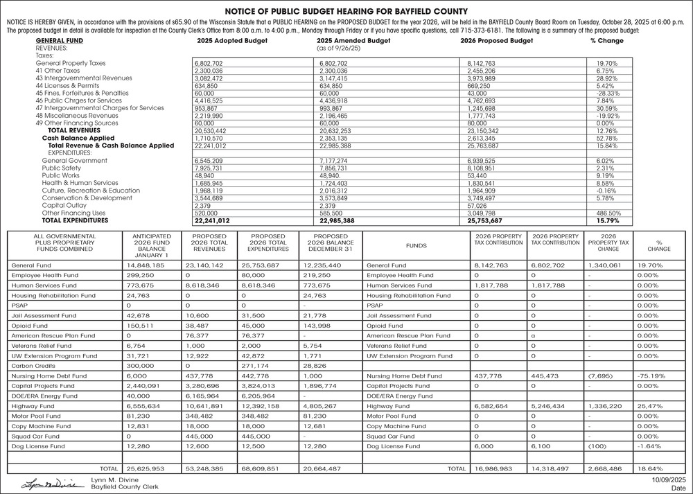 Oct 09, 2025. Bayfield County Public Notice Ads from Ashland Daily Press