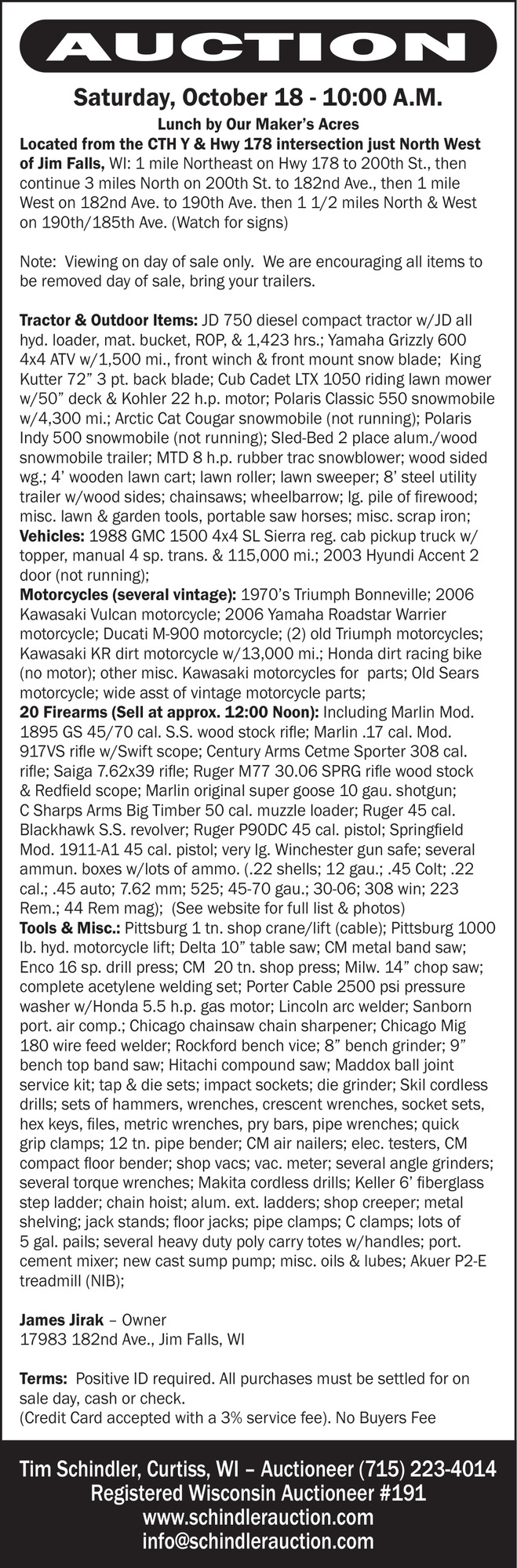 Oct 10, 2025. Tim Schindler Auctioneer Auctions Ads from Rice Lake Chronotype