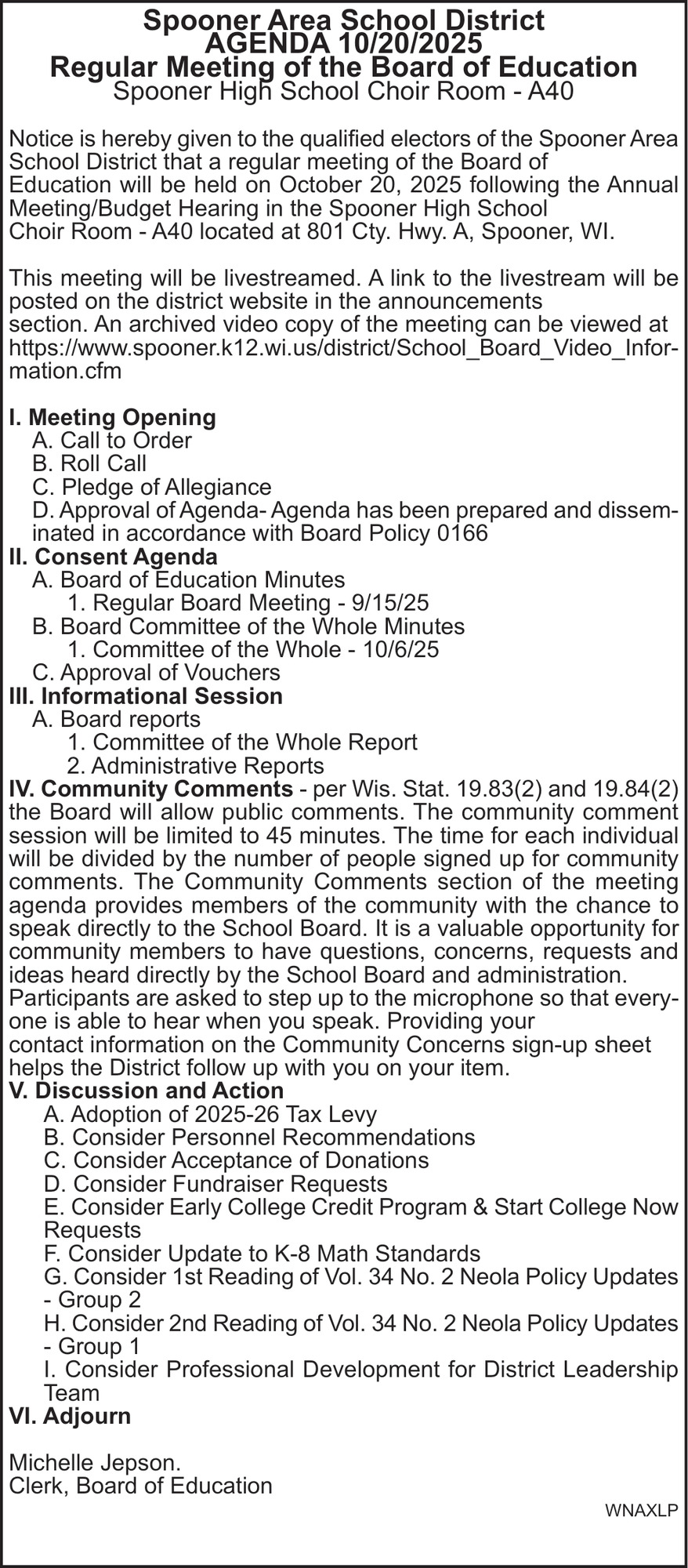 Oct 16, 2025. Spooner Area School District Public Notice Ads from Spooner Advocate