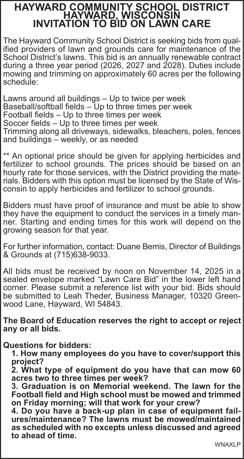 Oct 15, 2025. Hayward Community School District Public Notice Ads from Sawyer County Record