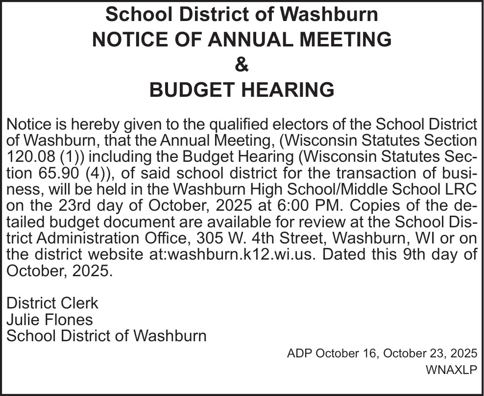 Oct 16, 2025. School District of Washburn Public Notice Ads from Ashland Daily Press