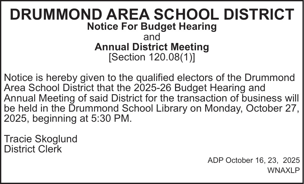 Oct 16, 2025. Drummond Area School District Public Notice Ads from Ashland Daily Press