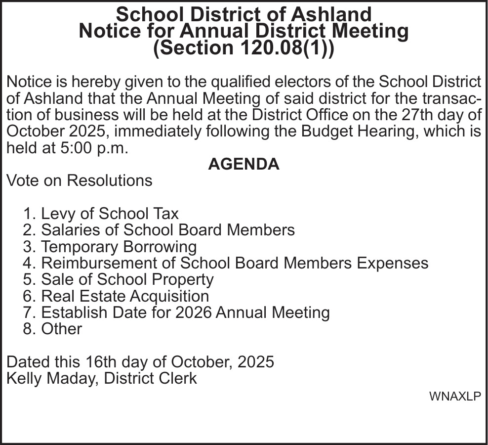 Oct 16, 2025. School District of Ashland Public Notice Ads from Ashland Daily Press
