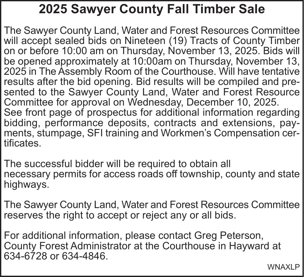 Oct 22, 2025. Sawyer County Public Notice Ads from Sawyer County Record