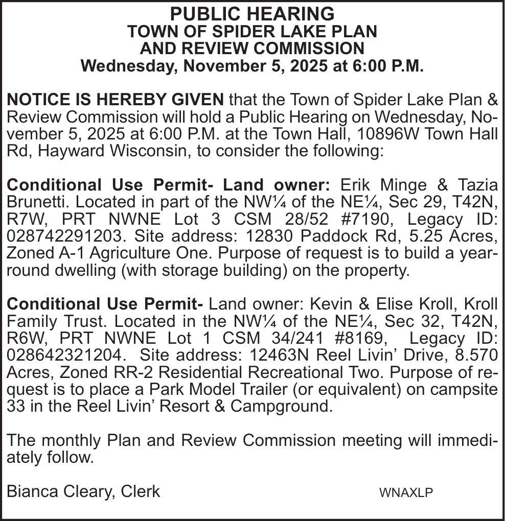 Oct 22, 2025. Town of Spider Lake Public Notice Ads from Sawyer County Record