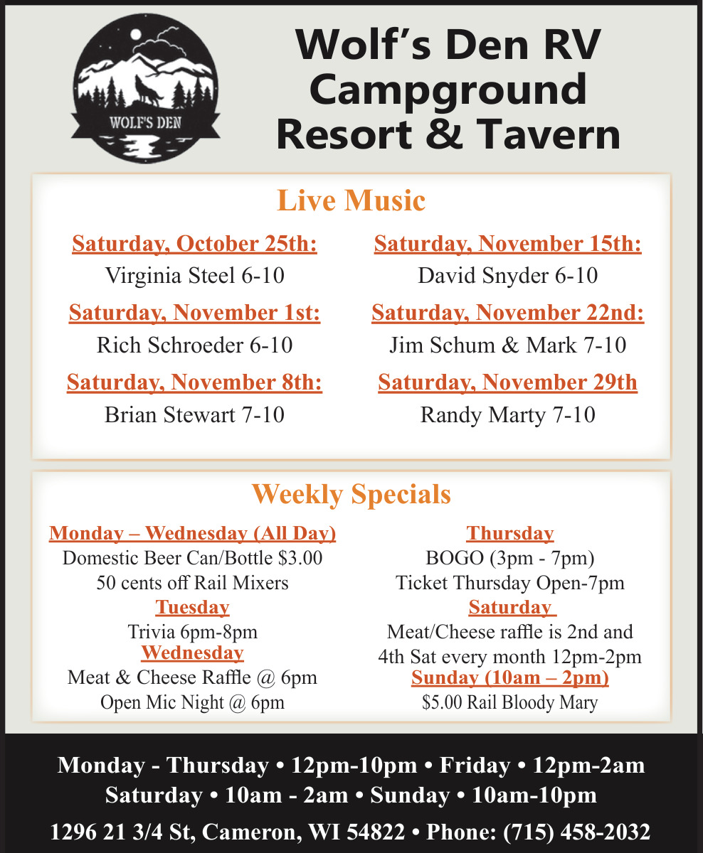 Oct 22, 2025. Wolf's Den RV Campground Campground Ads from Rice Lake Chronotype