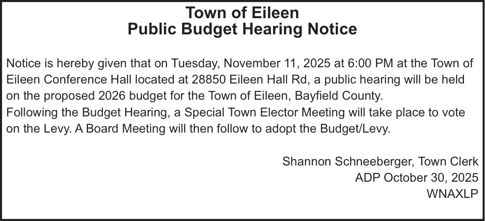 Oct 30, 2025. Town Of Eileen Public Notice Ads from Ashland Daily Press