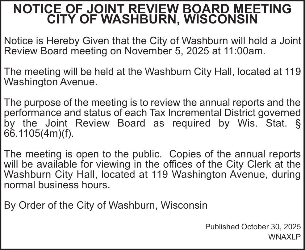 Oct 30, 2025. City Of Washburn Public Notice Ads from Ashland Daily Press