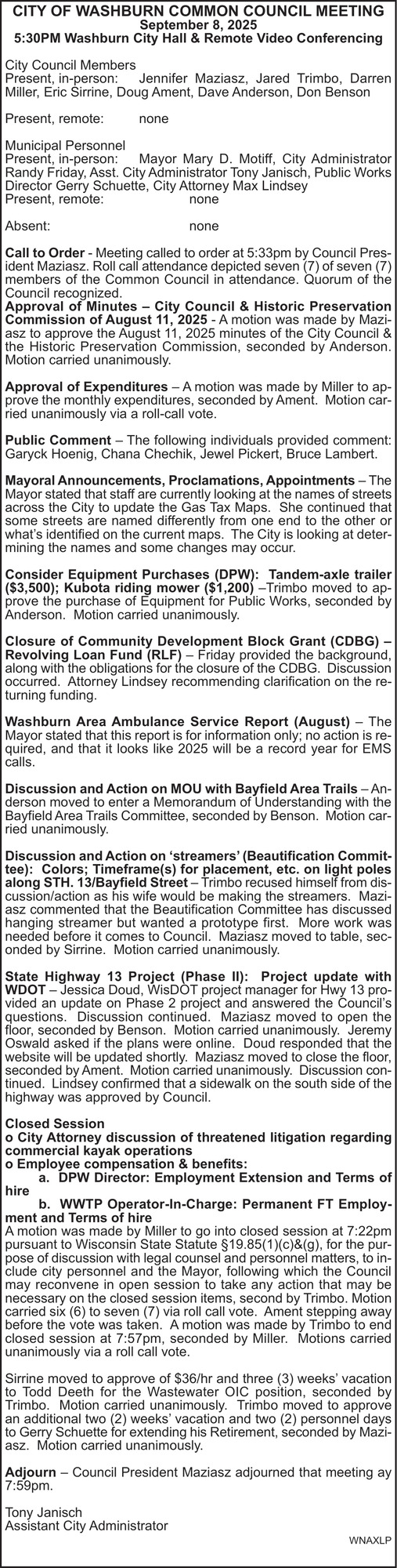 Oct 30, 2025. City Of Washburn Public Notice Ads from Ashland Daily Press