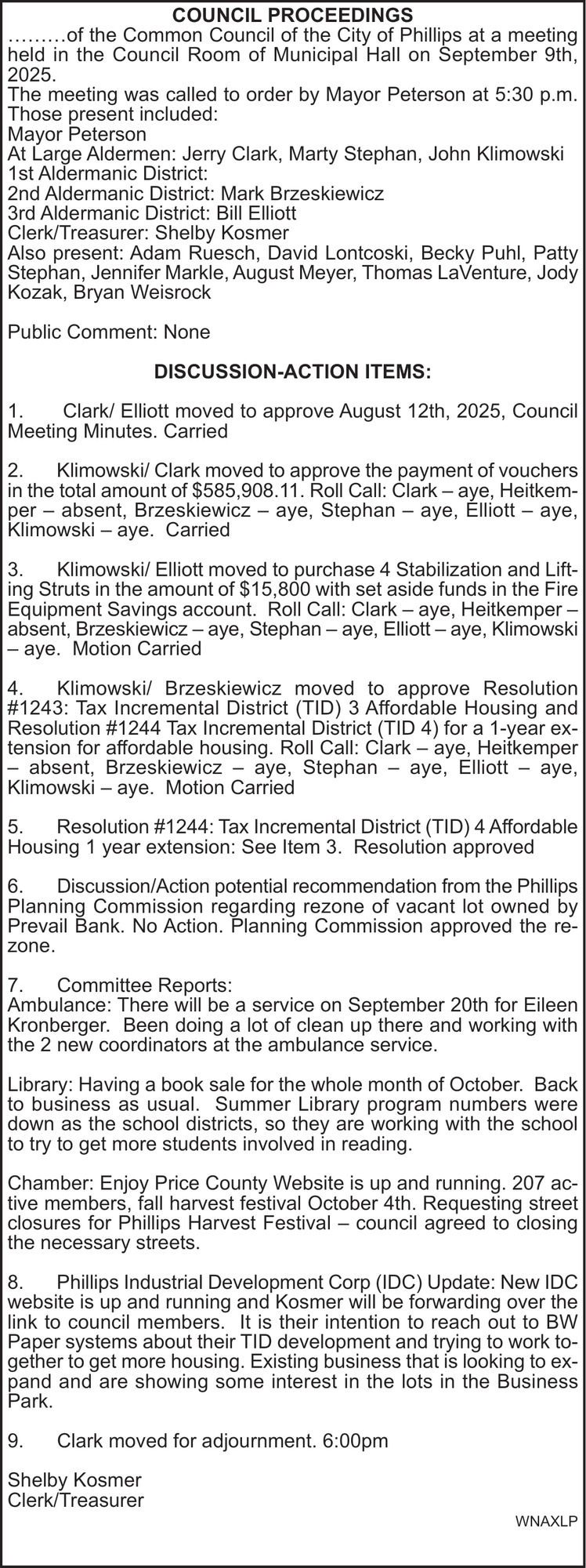 Oct 30, 2025. City Of Phillips Public Notice Ads from Price County Review