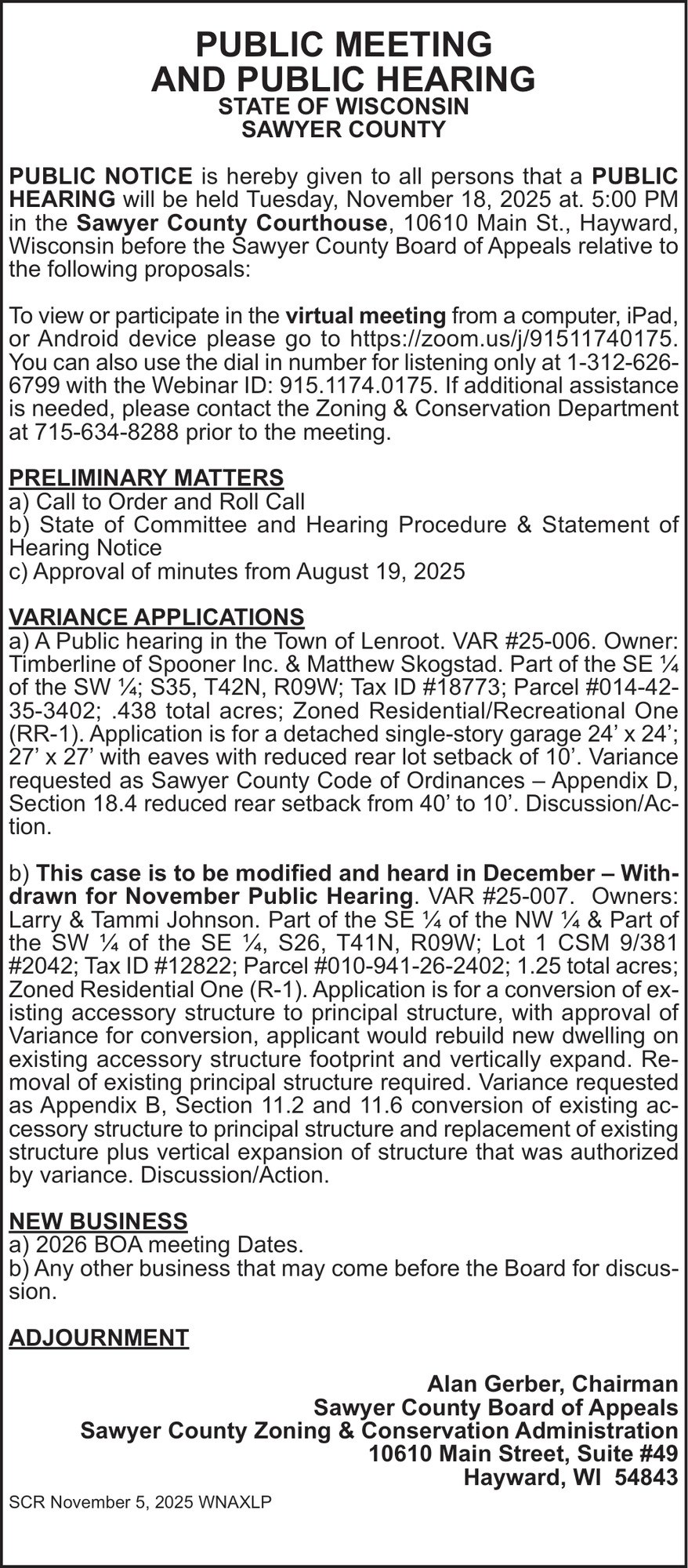 Nov 05, 2025. Sawyer County Public Notice Ads from Sawyer County Record