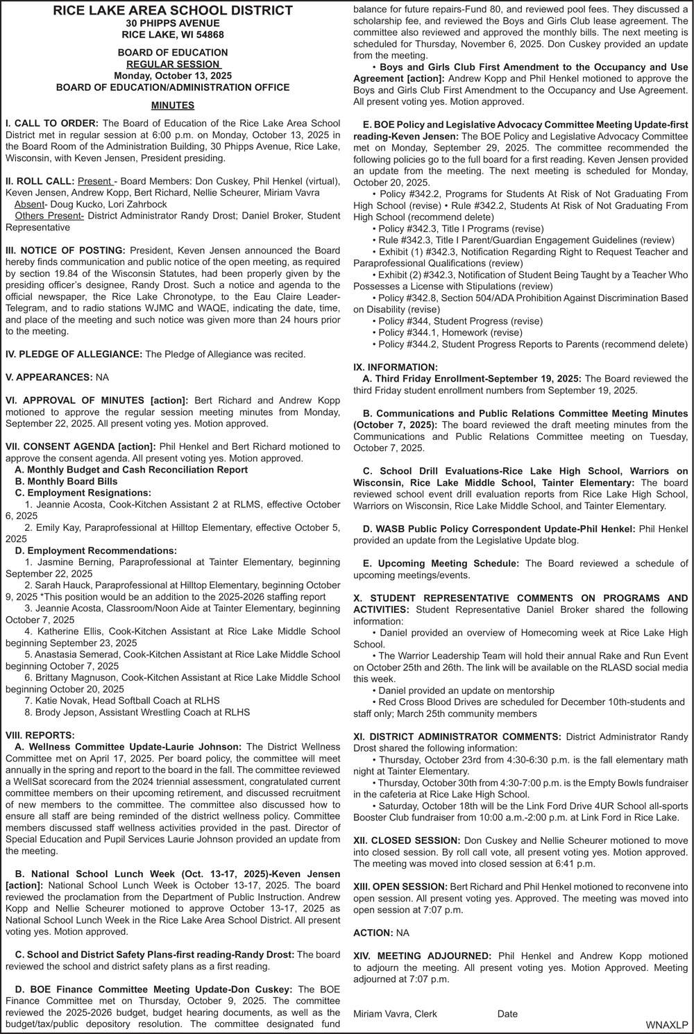 Nov 05, 2025. Rice Lake Area School District Public Notice Ads from Rice Lake Chronotype