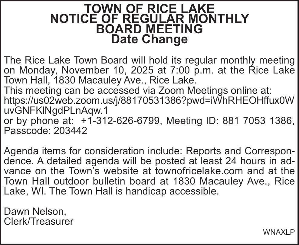 Nov 05, 2025. Town Of Rice Lake Public Notice Ads from Rice Lake Chronotype