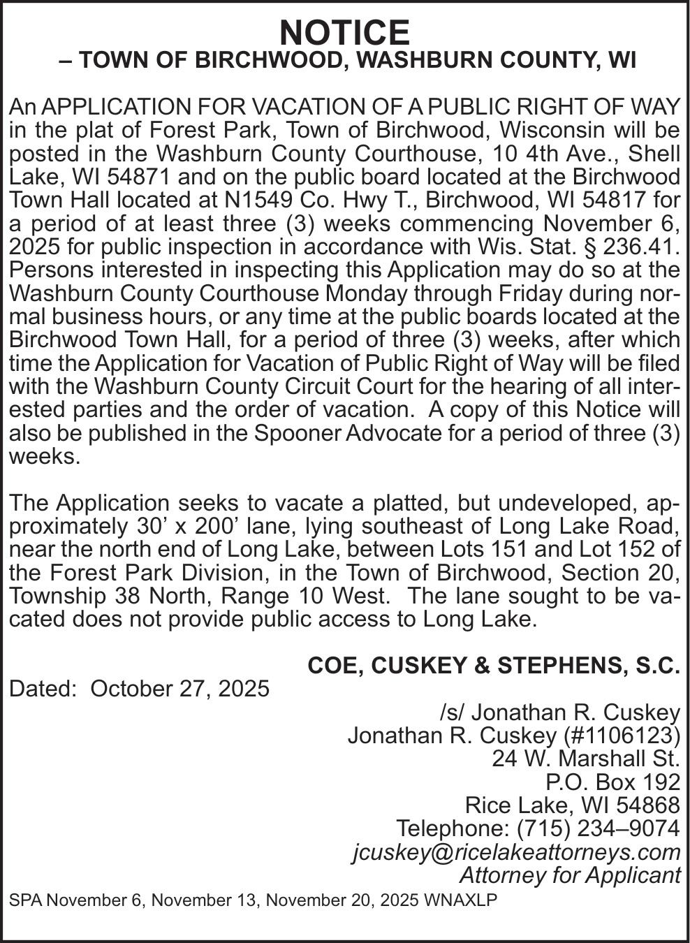 Nov 06, 2025. Town of Birchwood Public Notice Ads from Spooner Advocate