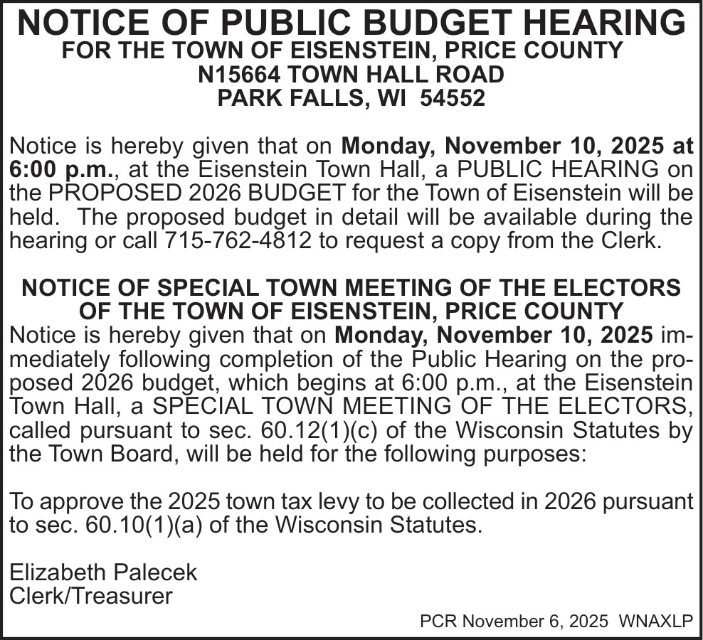 Nov 06, 2025. Town of Eisenstein Public Notice Ads from Price County Review