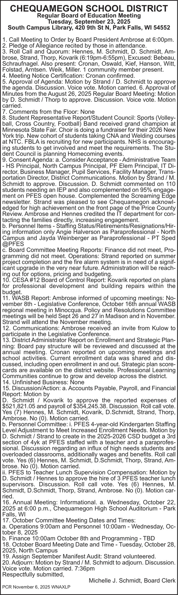 Nov 06, 2025. Chequamegon School District Public Notice Ads from Price County Review